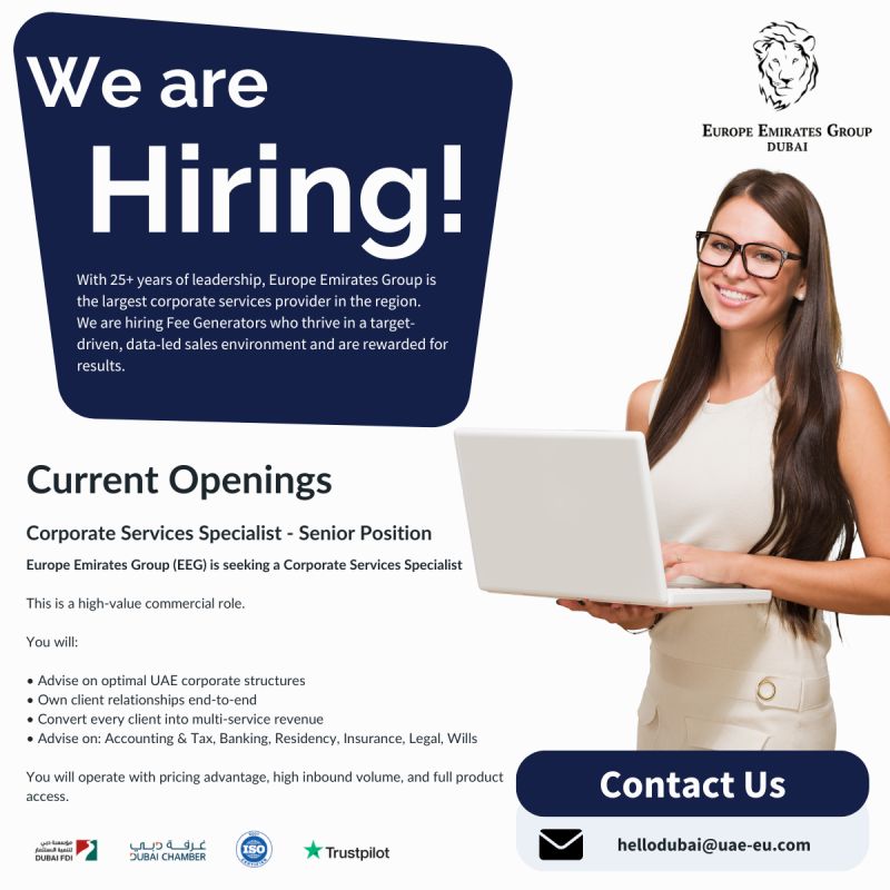 فرصة عمل في دبي لدى Europe Emirates Group بمسمى Corporate Services Specialist، مناسبة لمحترفي المبيعات والعلاقات التجارية في بيئة تنافسية.