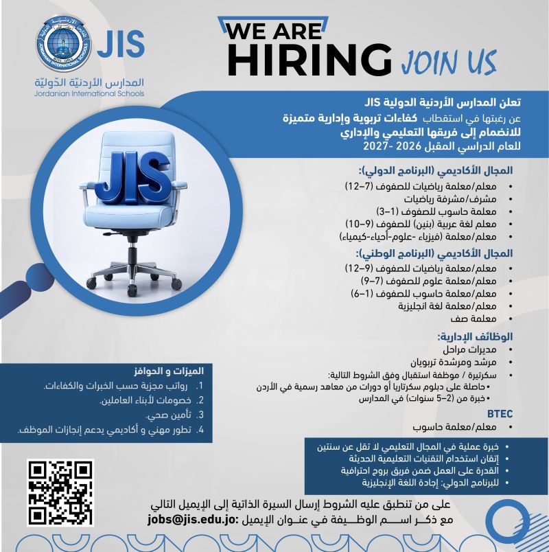 🏷️ وظائف تعليمية وإدارية في عمّان لدى مدارس JIS