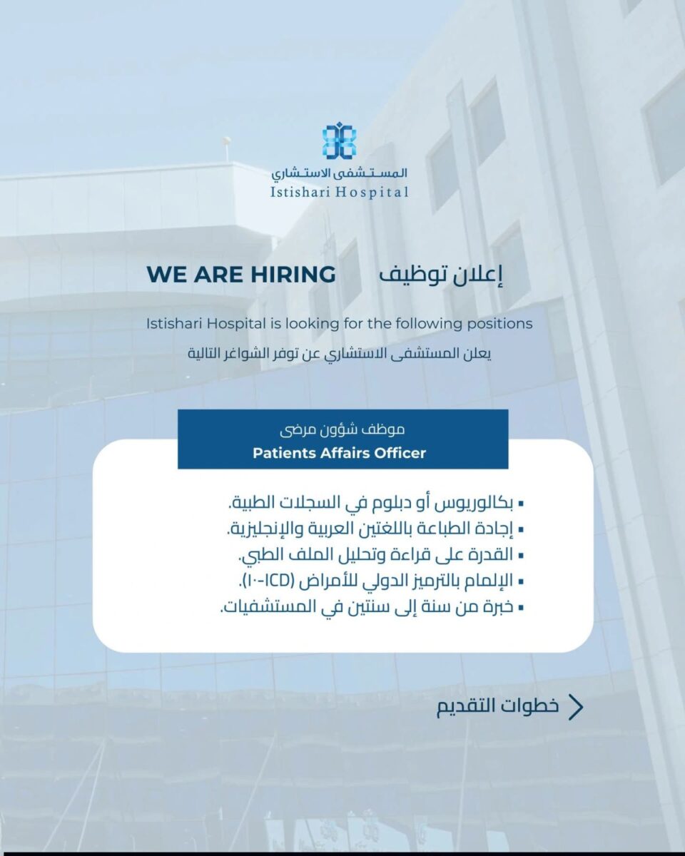 فرصة عمل موظف شؤون مرضى في عمّان لدى المستشفى الاستشاري، مناسبة لحاملي تخصص السجلات الطبية مع خبرة في القطاع الصحي.