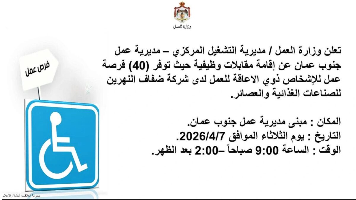 📄 تعلن وزارة العمل في الأردن عن مقابلات توظيف في عمّان لتوفير 40 فرصة عمل لذوي الإعاقة لدى شركة تعمل في قطاع الصناعات الغذائية والعصائر