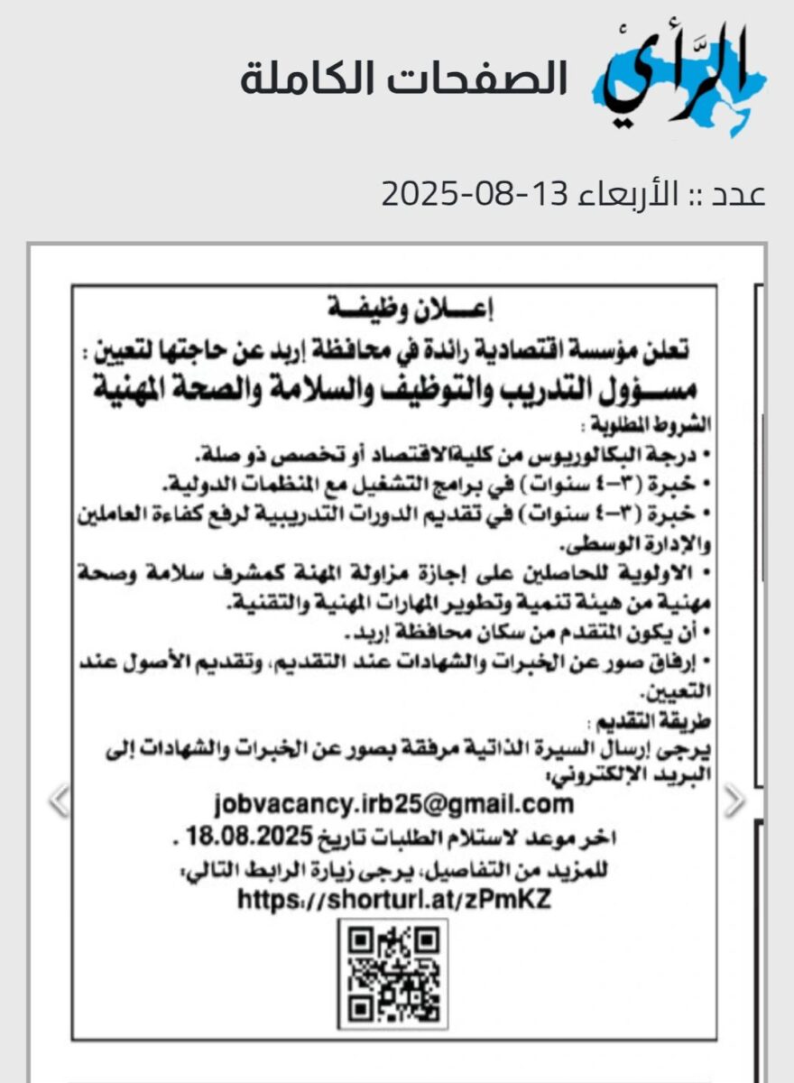📢 شاغر وظيفي – مسؤول التدريب والتوظيف والسلامة والصحة المهنية – إربد، الأردن