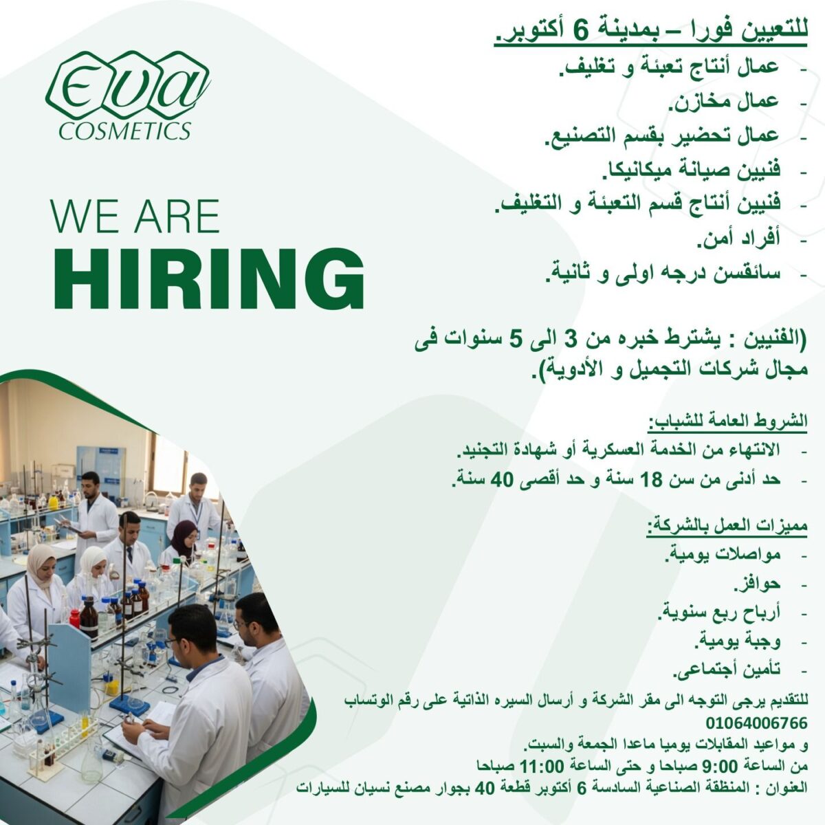 تُعلن شركة Eva Cosmetics عن فتح باب التقديم لتعيينات فورية في مصنعها بمدينة 6 أكتوبر، للعمل في عدة تخصصات في بيئة مهنية مستقرة ومزايا مميزة.