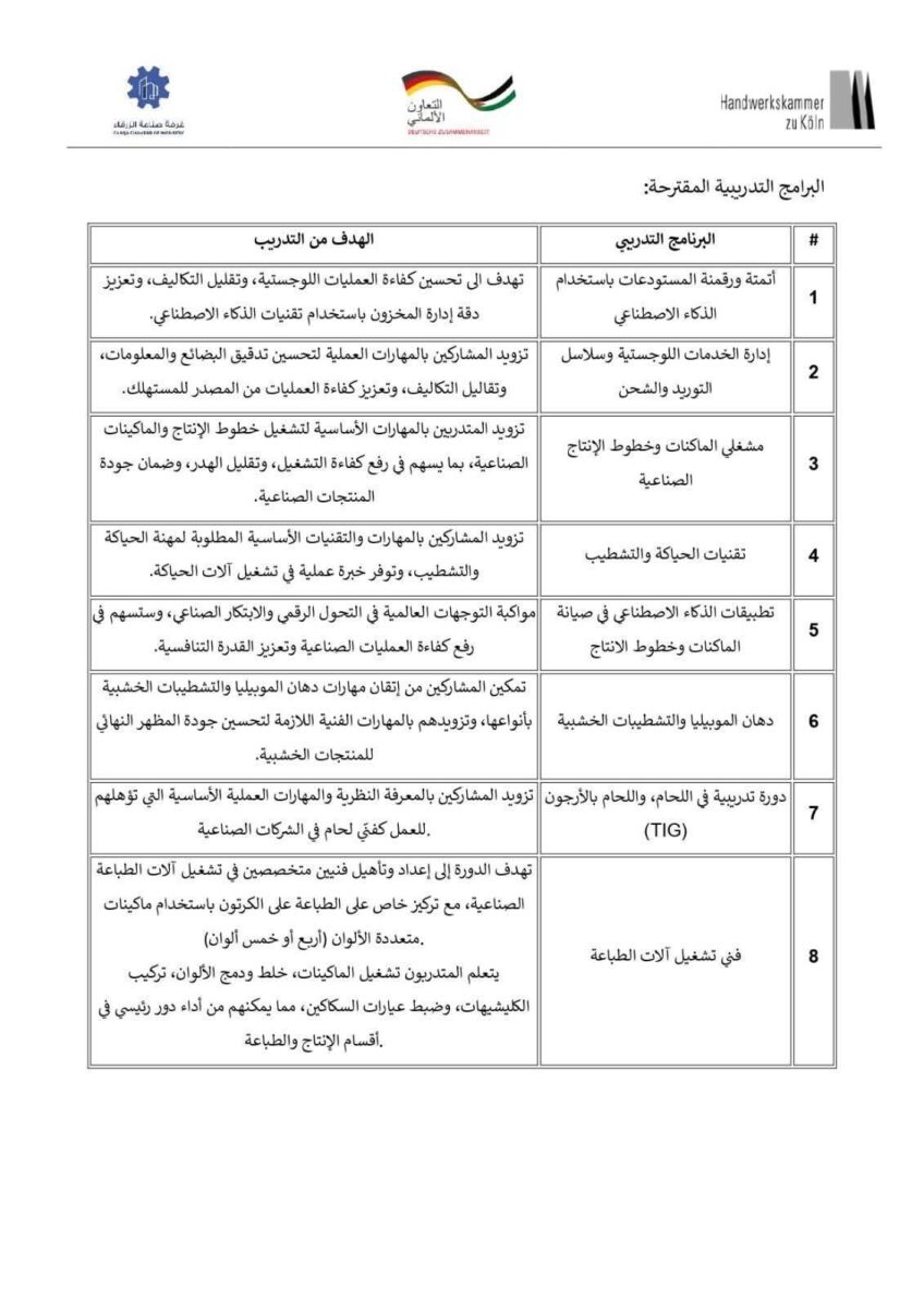 تُعلن غرفة صناعة الزرقاء عن فتح باب استقبال طلبات التعاقد مع مدربين ومزودي تدريب محترفين، ضمن مشروع تدريبي مشترك مع غرفة كولون الحرفية الألمانية (HWK zu Köln)، وذلك لتنفيذ برامج تدريبية قصيرة ومتخصصة تستهدف رفع كفاءة العاملين في القطاعات الصناعية بالأردن.