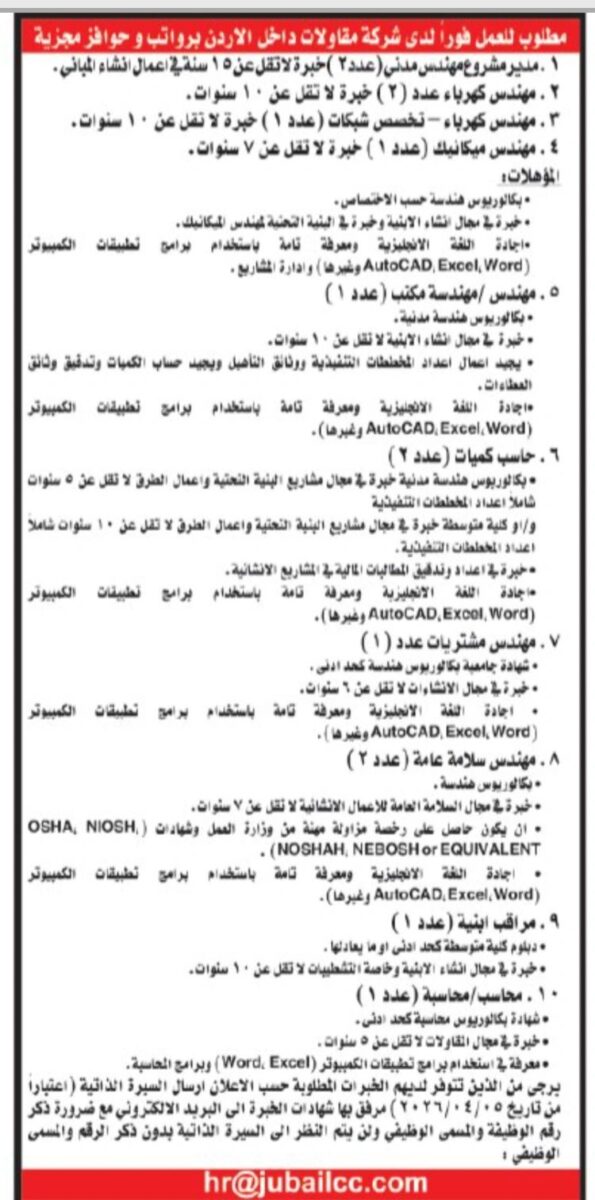 📄 تعلن شركة مقاولات كبرى في الأردن عن توفر وظائف متعددة برواتب وحوافز مجزية في مجالات الهندسة والإدارة.