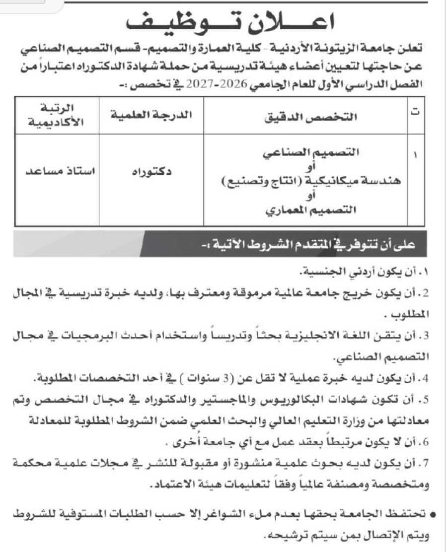 📄 تعلن جامعة الزيتونة الأردنية عن توفر شاغر أكاديمي لأعضاء هيئة تدريس في كلية العمارة والتصميم – قسم التصميم الصناعي.