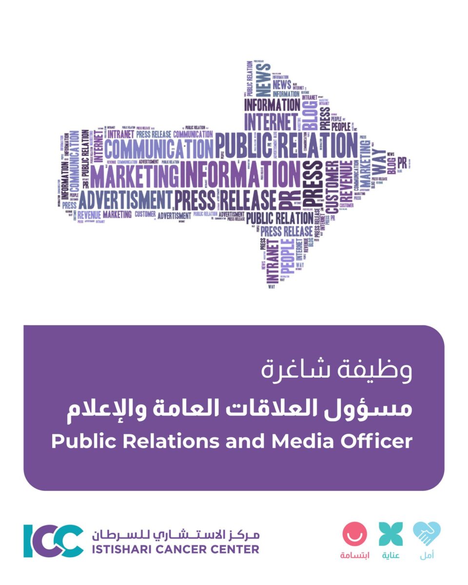 يعلن مركز الاستشاري للسرطان – الريحان – رام الله، التابع لمجموعة المستشفيات العربية، عن حاجته لتوظيف مسؤول علاقات عامة وإعلام ذو كفاءة عالية وخبرة في مجال الإعلام الصحي والتواصل المجتمعي.