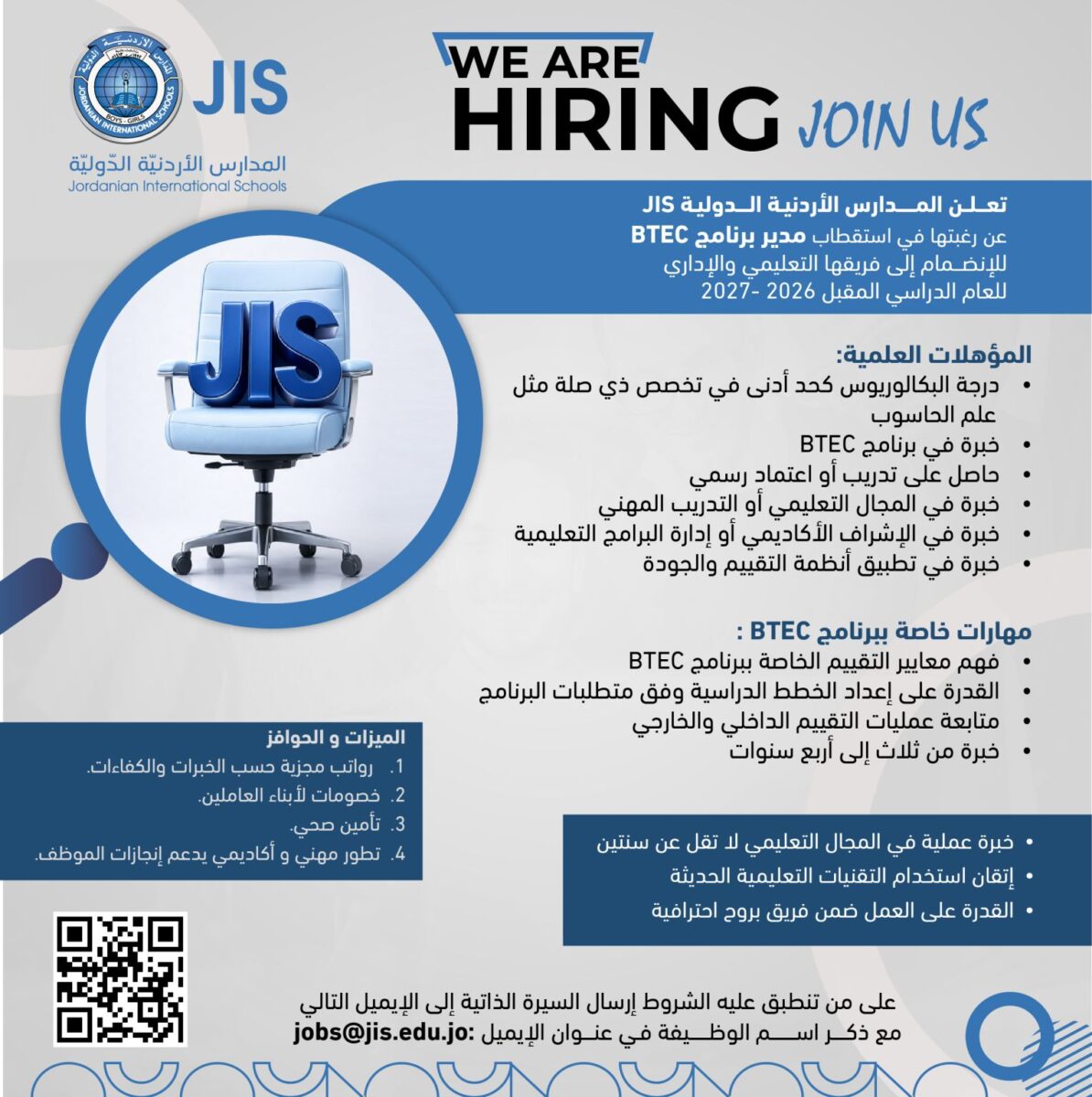 📄 فرصة تعليمية مميزة للعمل كمدير برنامج BTEC في عمّان – الأردن لدى المدارس الأردنية الدولية، مناسبة لأصحاب الخبرة في التعليم والتدريب المهني