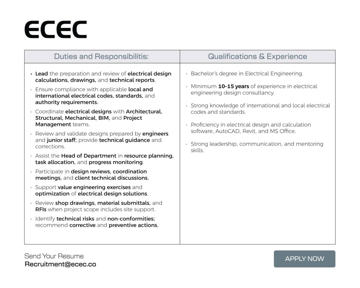 📄 فرصة عمل لمهندس تصميم كهربائي أول في عمّان لدى ECEC، مناسبة لأصحاب الخبرة الطويلة في التصميم الهندسي والاستشارات