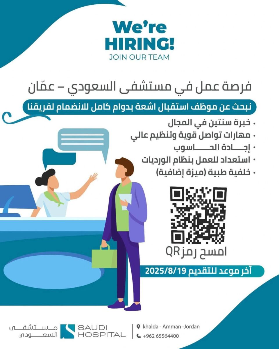 يعلن مستشفى السعودي في عمان عن حاجته لتوظيف موظف استقبال أشعة بدوام كامل للانضمام إلى فريق العمل الطبي.