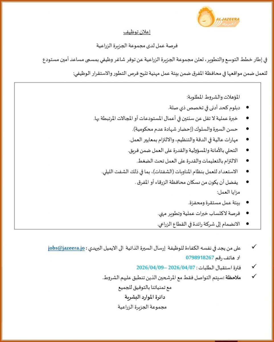 🏷️ وظيفة مساعد أمين مستودع في المفرق لدى الجزيرة