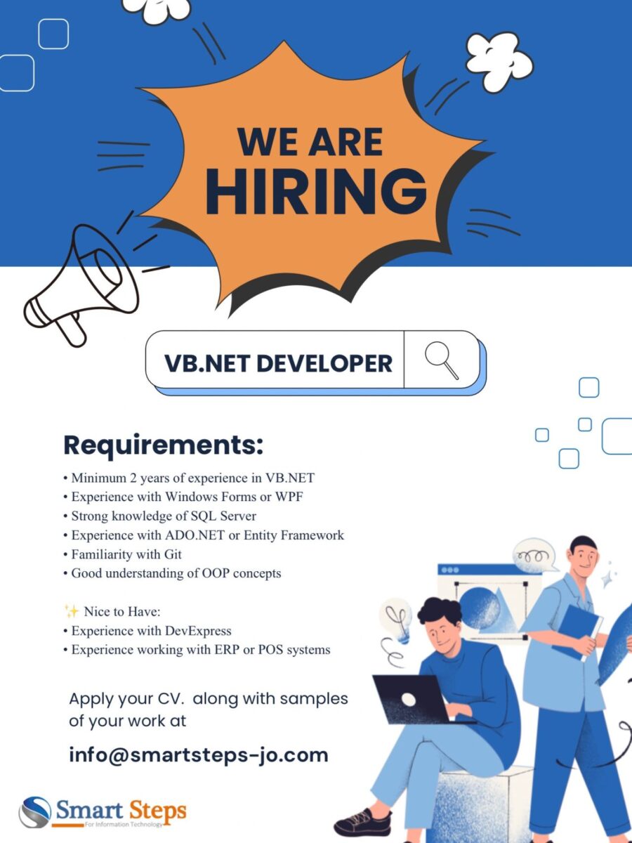 📄 فرصة عمل لمطور VB.NET في الأردن لدى شركة Smart Steps، مناسبة للمبرمجين بخبرة في تطبيقات سطح المكتب وقواعد البيانات مع بيئة تطوير احترافية