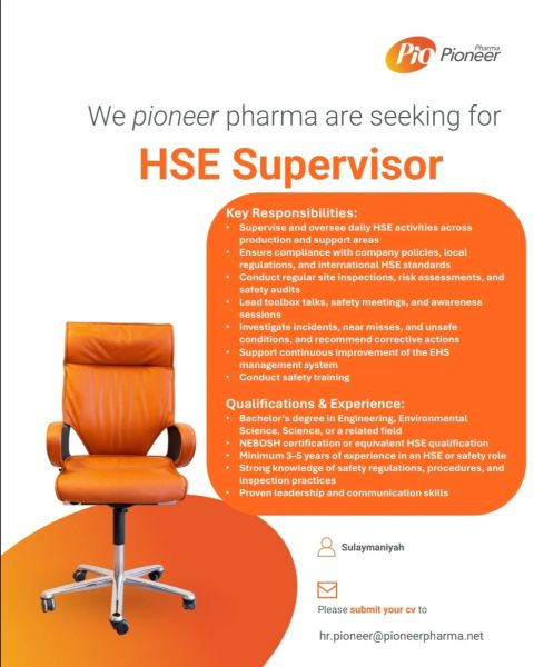 مشرف سلامة وصحة مهنية في السليمانية لدى Pioneer Pharma فرصة مهمة للعمل في قطاع الصناعات الدوائية مع دور أساسي في ضمان بيئة عمل آمنة ومتوافقة مع المعايير الدولية.