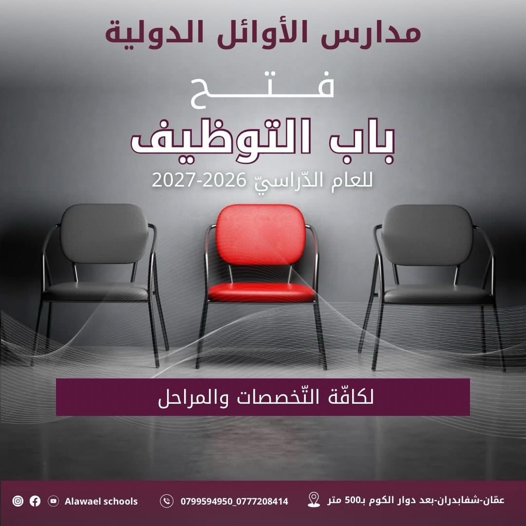 وظائف تعليمية وإدارية في عمّان لدى مدارس الأوائل الدولية فرصة مميزة للانضمام إلى مؤسسة تعليمية تسعى للتوسع واستقطاب الكفاءات في مختلف التخصصات.