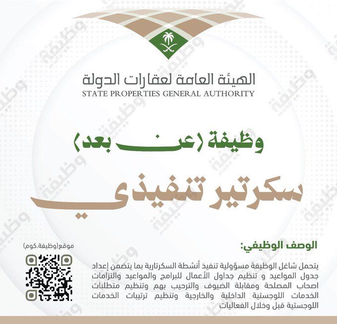 📄 فرصة عمل حكومية عن بعد في السعودية بوظيفة سكرتير تنفيذي لدى الهيئة العامة لعقارات الدولة مع مزايا تنافسية لحملة الدبلوم
