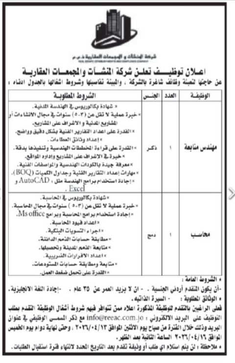 فرص عمل في الأردن لمهندس مدني ومحاسب لدى شركة عقارية، وظائف إدارية وهندسية بخبرة متوسطة ضمن بيئة احترافية