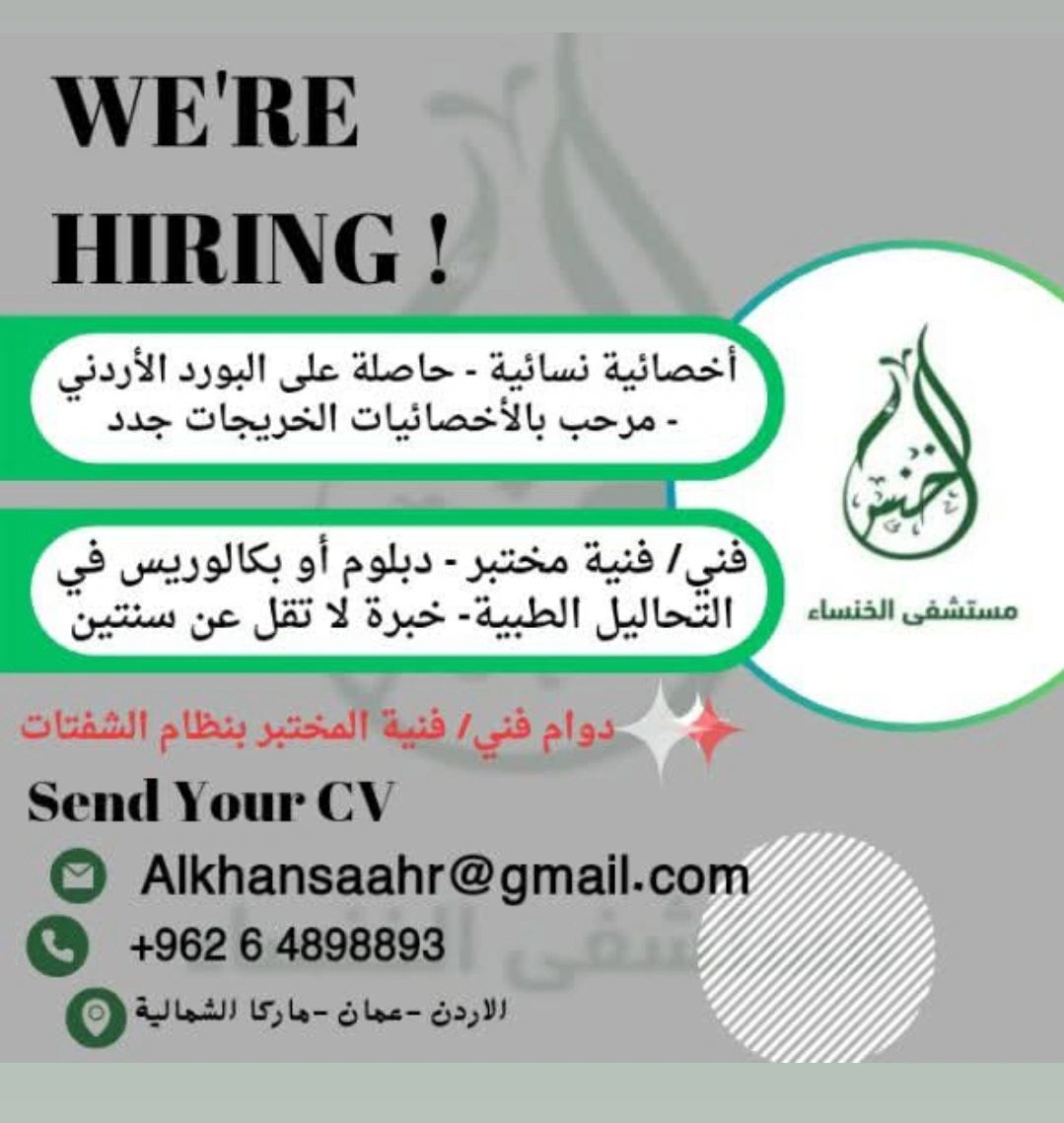 فرص عمل في عمّان لدى مستشفى الخنساء لأخصائية نسائية وفني مختبر، وظائف طبية ضمن بيئة صحية متكاملة