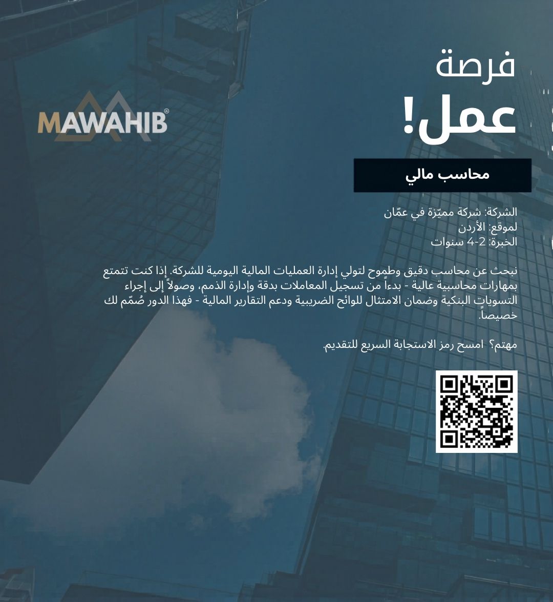 الوظيفة مقدمة عبر منصة Mawahib، والتي تعمل على ربط الكفاءات بالفرص الوظيفية المناسبة في السوق الأردني.