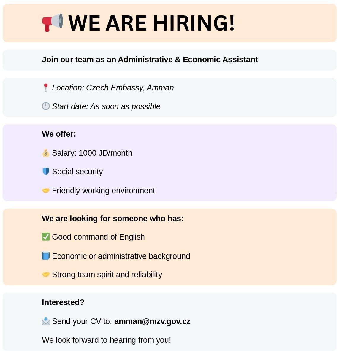 📢 وظائف شاغرة في عمان 2025 – مساعد إداري واقتصادي في السفارة التشيكية