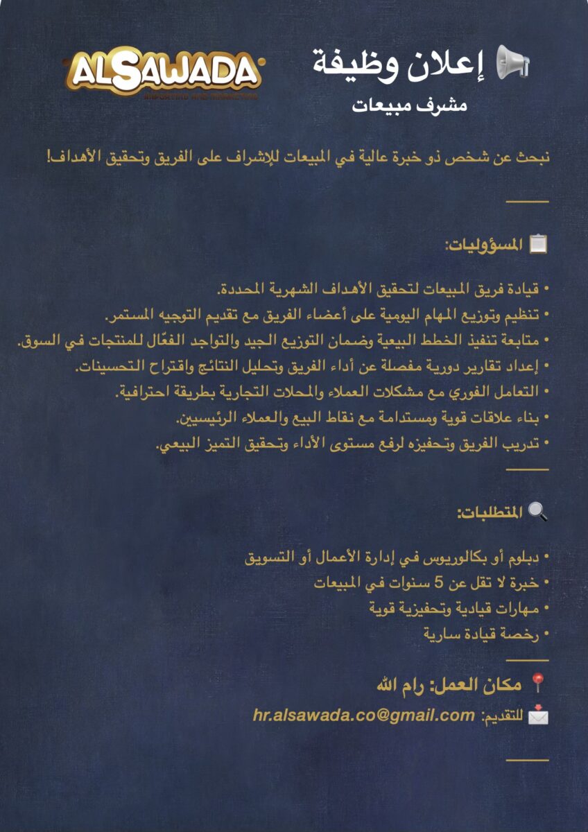 📢 وظائف في فلسطين – مشرف مبيعات | رام الله