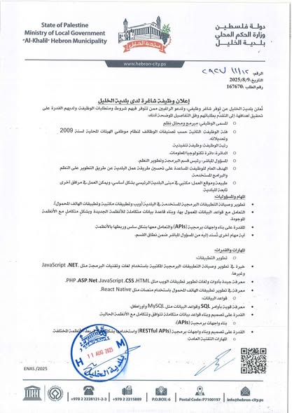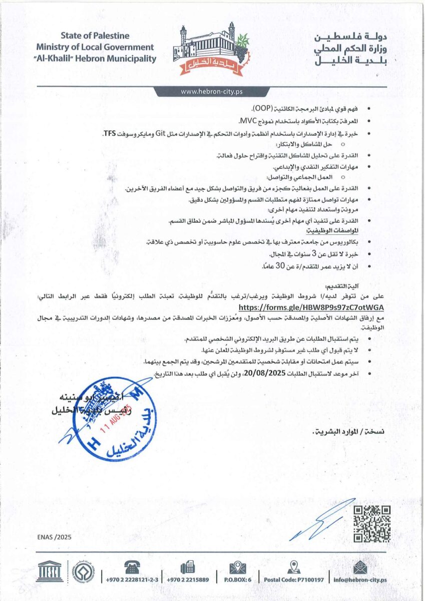 📢 إعلان وظائف برمجة – بلدية الخليل فلسطين 2025