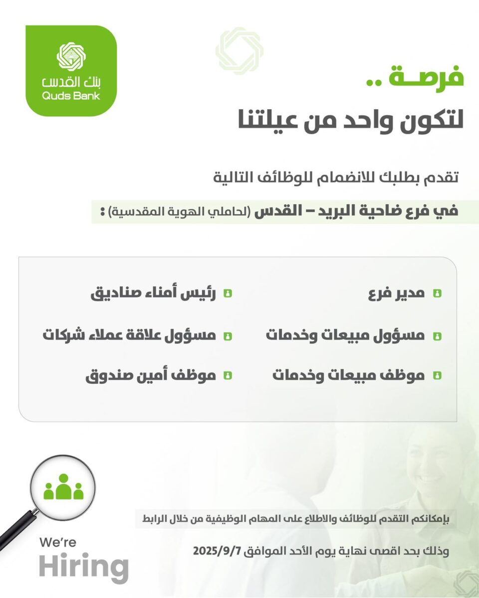 📢 وظائف مصرفية في القدس 2025 – بنك القدس يعلن عن فرص توظيف مميزة