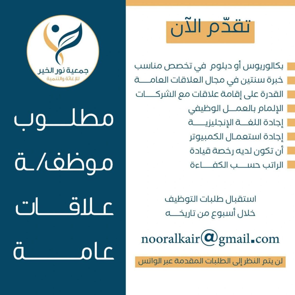 تُعلن جمعية نور الخير للإغاثة والتنمية عن حاجتها لتعيين موظف أو موظفة علاقات عامة بدوام كامل ضمن فريقها الإداري.