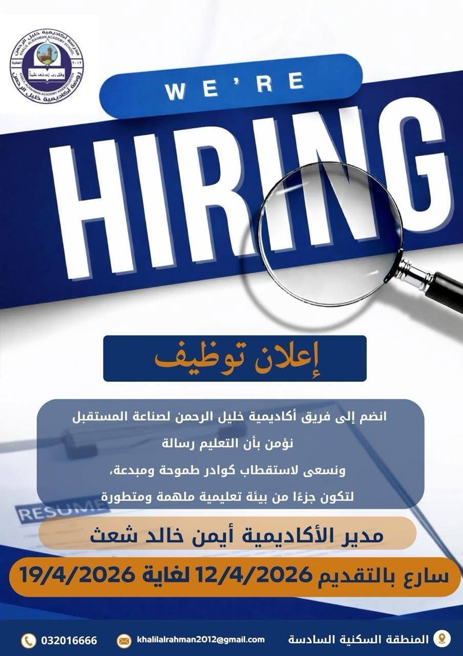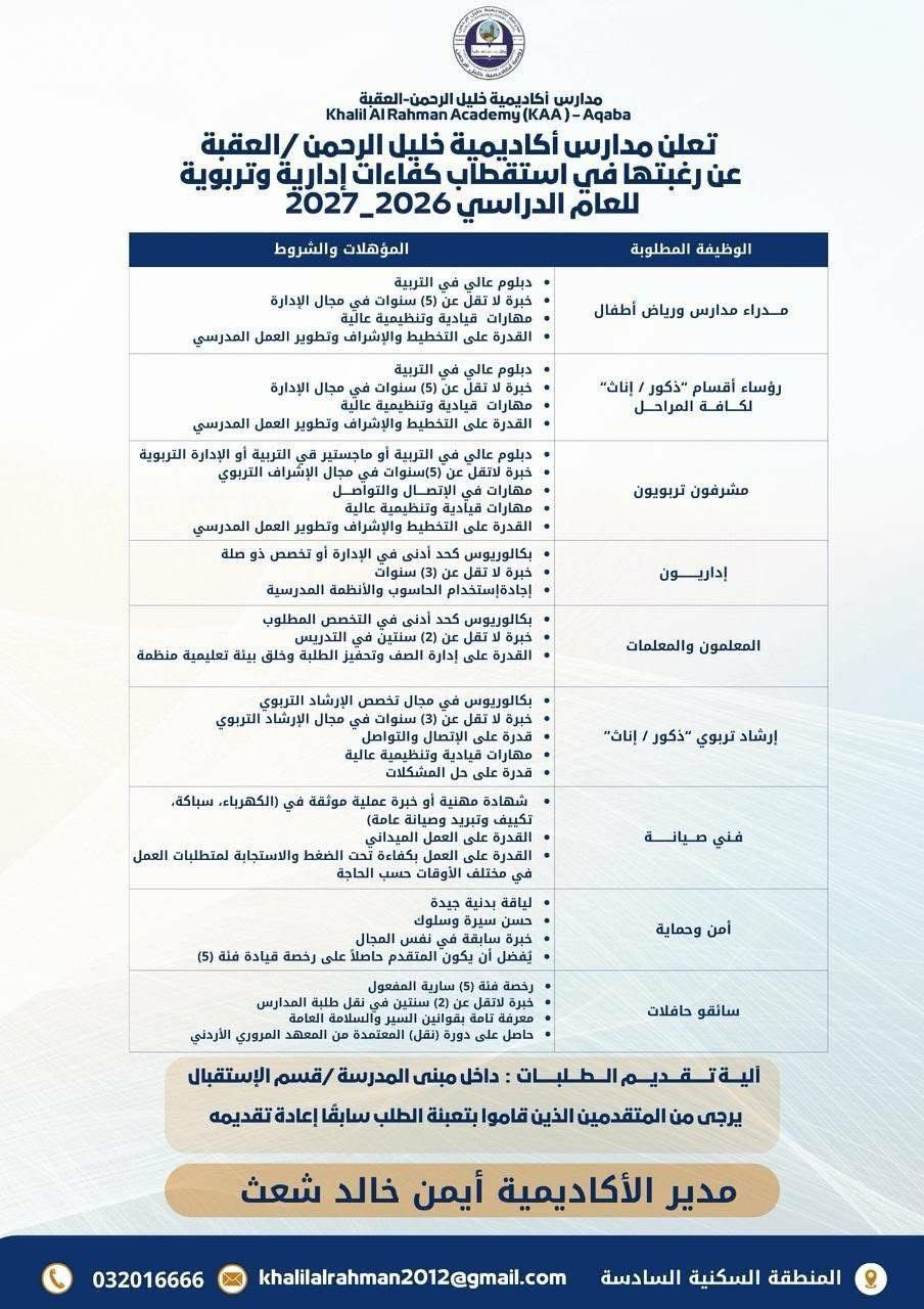 📄 فرص عمل جديدة في العقبة بالأردن لدى أكاديمية خليل الرحمن تشمل وظائف تعليمية وإدارية برواتب تنافسية وبيئة تعليمية متطورة للعام الدراسي الجديد