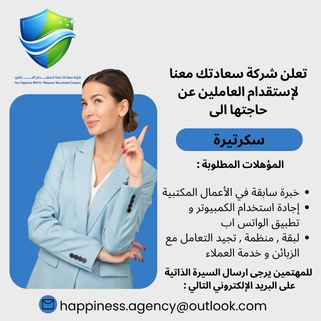 فرصة عمل سكرتيرة في عمّان لدى Your Happiness With Us Manpower Recruitment Company بدوام كامل ضمن بيئة إدارية منظمة.