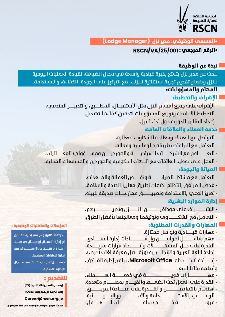 تعلن الجمعية الملكية لحماية الطبيعة عن توفر وظيفة مدير نزل (Lodge Manager) للعمل ضمن فريقها المتخصص في إدارة النزل البيئية والسياحية، وذلك في الأردن لعام 2025.
