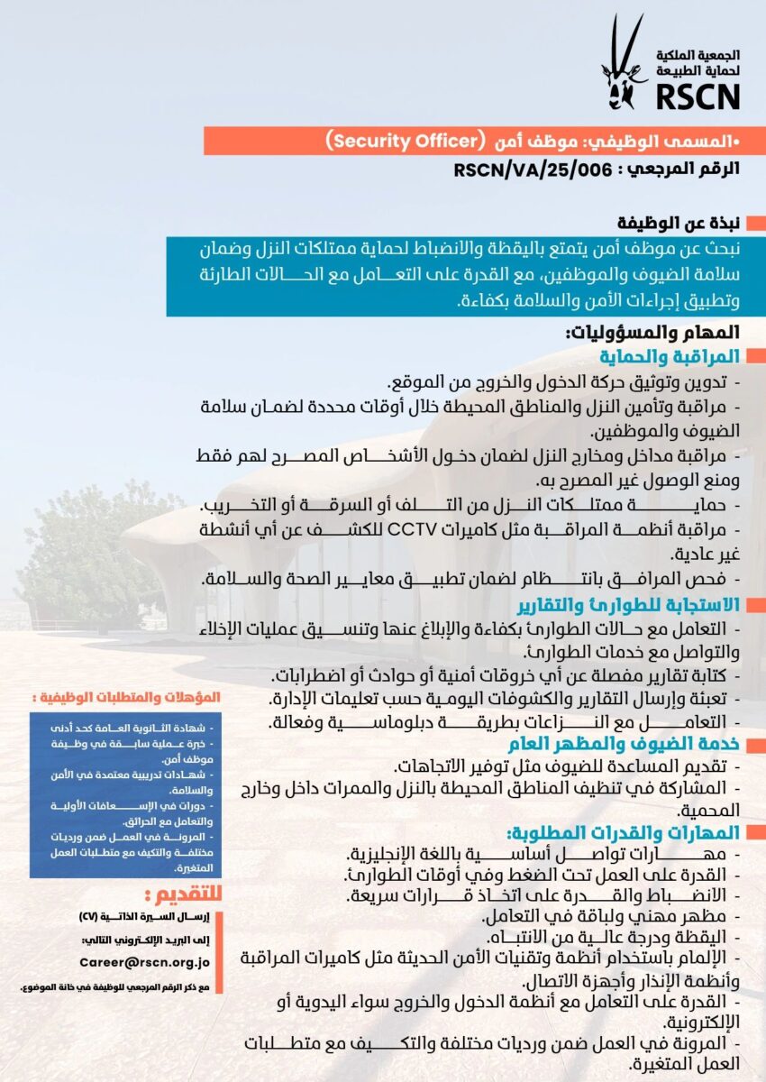 تعلن الجمعية الملكية لحماية الطبيعة عن حاجتها لتعيين موظف أمن (Security Officer) للعمل في نزل سياحي ضمن فريق الحماية والمراقبة للحفاظ على أمن النزل والزوار.