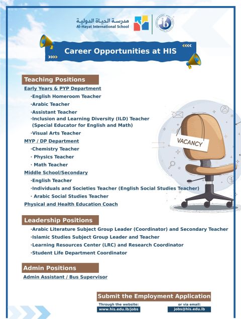 📄 فرص عمل تعليمية في بيروت لدى مدرسة الحياة الدولية، تشمل تخصصات متعددة وبيئة عمل حديثة تدعم التطور المهني للمعلمين