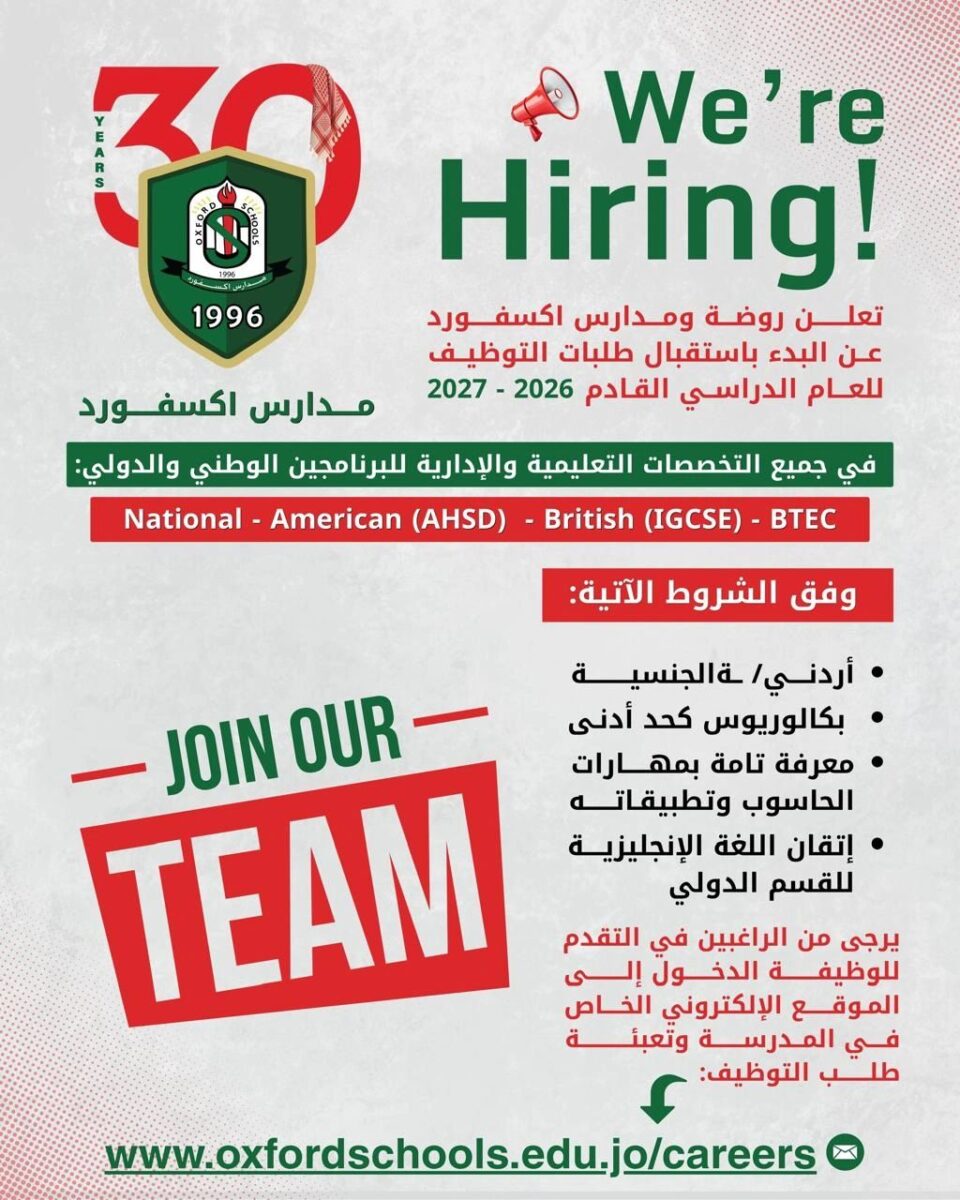فرص عمل تعليمية وإدارية في عمّان الأردن لدى مدارس أكسفورد للعام الدراسي 2026–2027 ضمن برامج دولية ووطنية وبيئة تعليمية متطورة