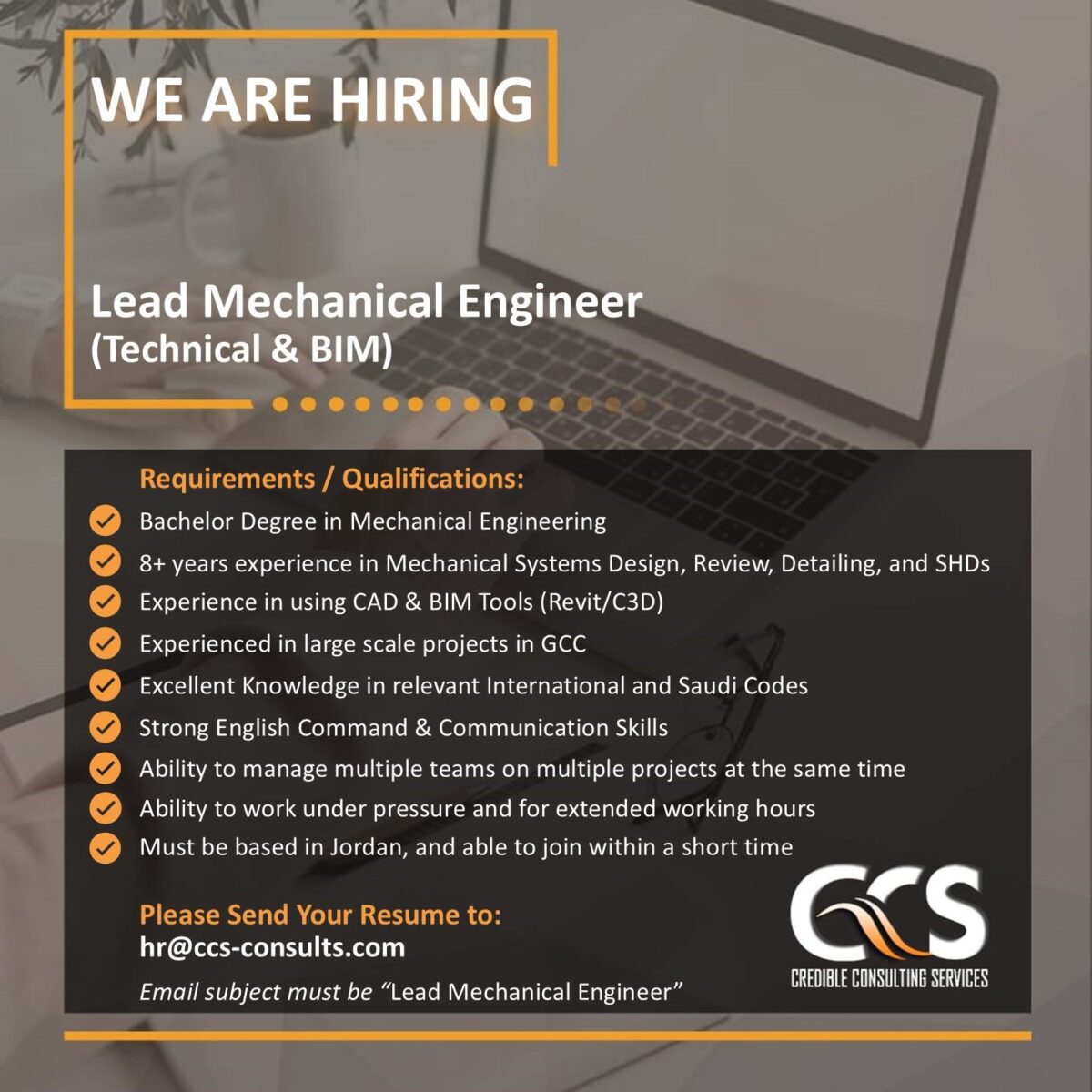 هل تبحث عن وظيفة مهندس ميكانيكي رئيسي في الأردن لعام 2025؟ نقدم لك فرصة مميزة للعمل مع شركة Credible Consulting Services في مشاريع كبيرة ومتنوعة ضمن دول الخليج.