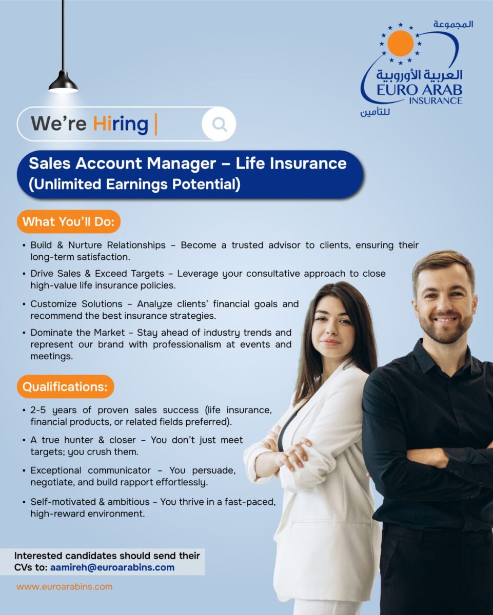 تعلن شركة Euro Arab Insurance Group في عمّان – الأردن عن توفر شاغر وظيفي بمسمى Sales Account Manager – Life Insurance للعمل بدوام كامل، ضمن فريق مبيعات محترف يهدف لتقديم حلول تأمينية عالية القيمة للعملاء.