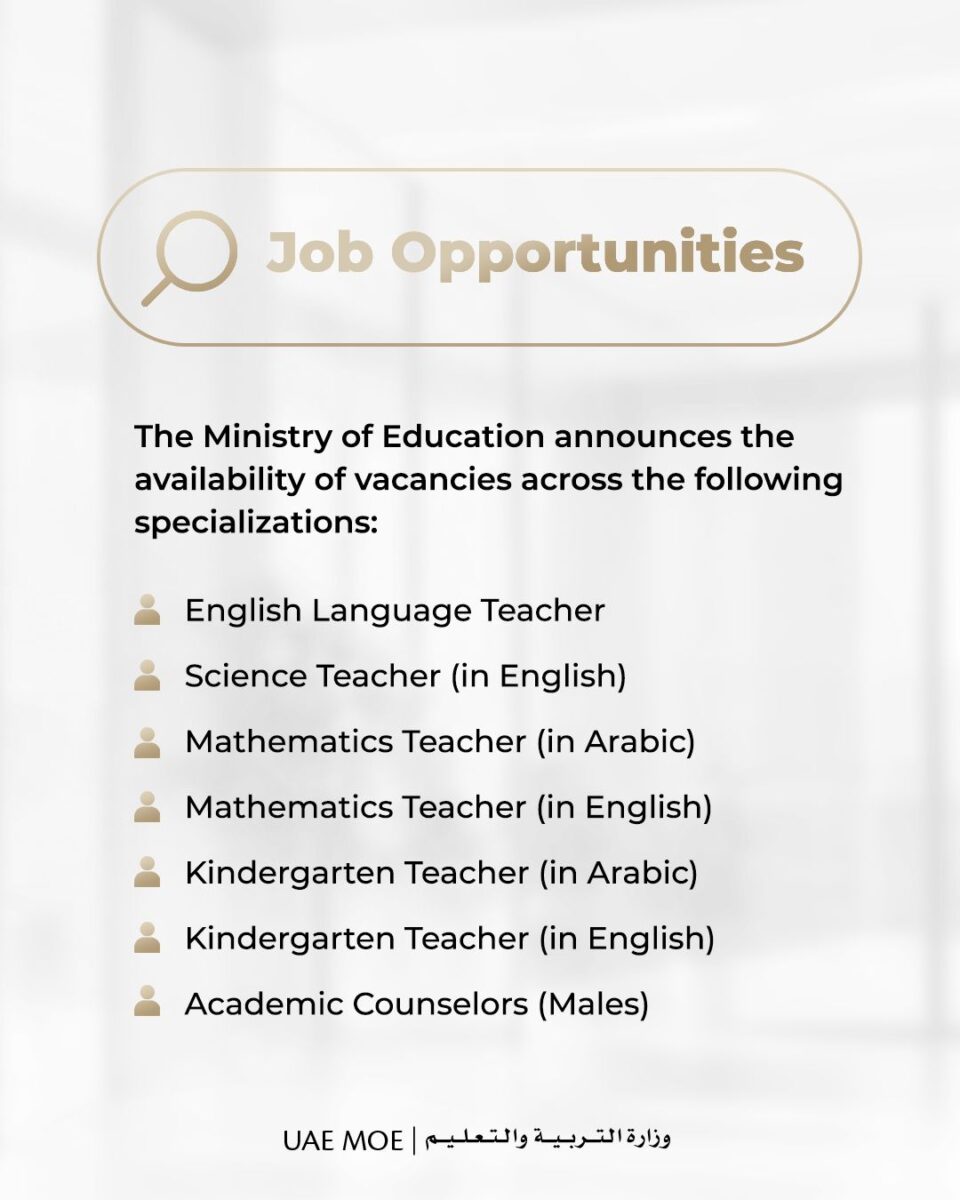 فرص عمل تعليمية في الإمارات لدى وزارة التربية والتعليم تشمل معلمين ومرشدين أكاديميين ضمن بيئة تعليمية حكومية متطورة.