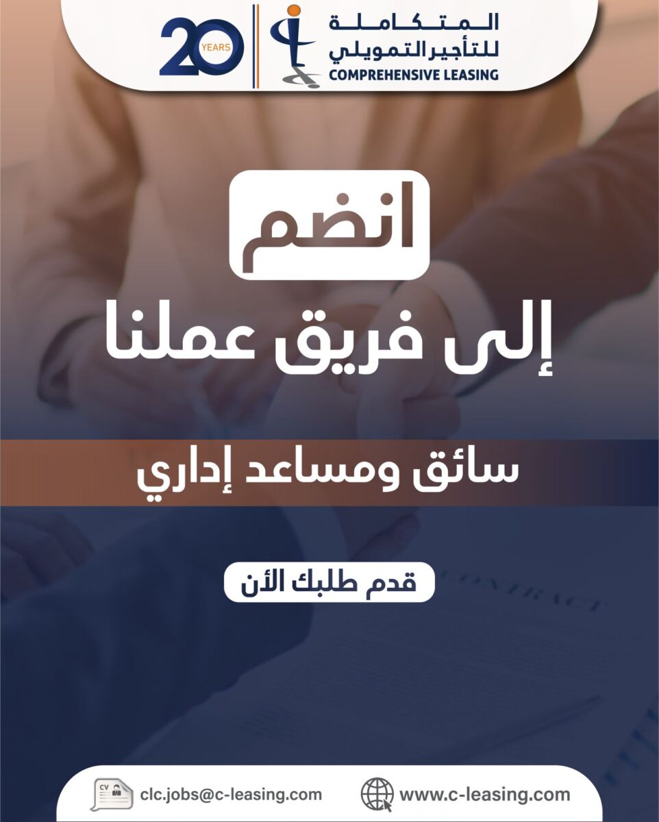 تعلن شركة المتكاملة للتأجير التمويلي عن حاجتها لتعيين سائق ومساعد إداري للقيام بالمهام الإدارية اليومية ودعم العمليات التشغيلية للشركة.