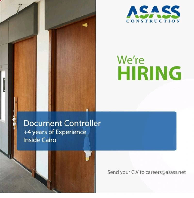 تعلن شركة ASASS Construction الرائدة في مجال البناء عن حاجتها لتعيين Document Controller للعمل في مقرها داخل القاهرة، بخبرة لا تقل عن 4 سنوات.