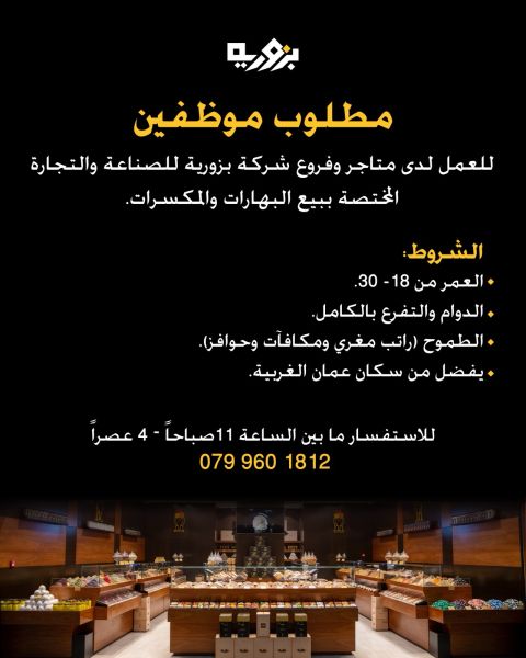 إذا كنت تبحث عن وظائف في عمّان بدوام كامل داخل شركة تعمل في بيع البهارات والمكسرات وتوفر راتبًا مغريًا وحوافز ومكافآت، فإن هذه الفرصة تستحق الاهتمام. أعلنت شركة بزورية للصناعة والتجارة عن حاجتها إلى موظفين للعمل لدى محلاتها وفروعها، وهي فرصة مناسبة للشباب الباحثين عن عمل مستقر في قطاع البيع بالتجزئة ضمن بيئة تعتمد على الجدية والتفرغ الكامل.
