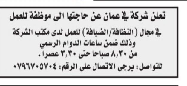 تُعلن إحدى الشركات في مدينة عمّان عن حاجتها إلى موظفة للعمل في مجال النظافة والضيافة، وذلك للعمل داخل مكتب الشركة ضمن أوقات الدوام الرسمي.