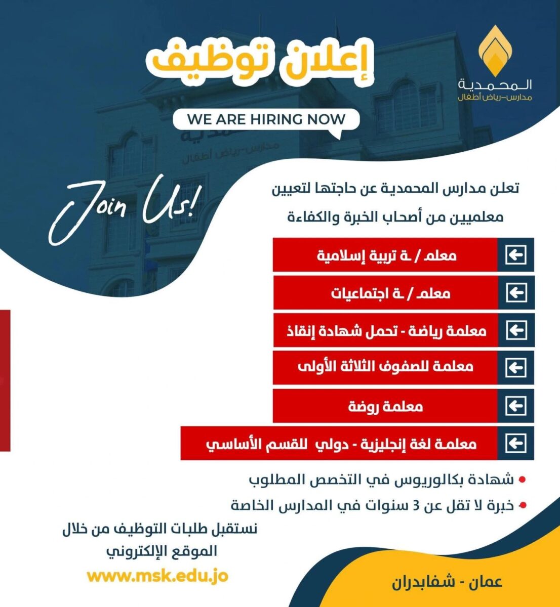 تُعلن مدارس المحمدية – عمان / شفابدران عن حاجتها لتعيين معلمين ومعلمات من أصحاب الكفاءة والخبرة، ضمن التخصصات التالية: