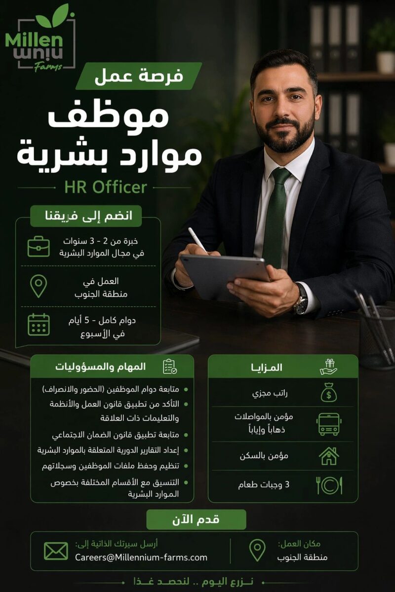 تُعد وظيفة موظف موارد بشرية لدى Millennium Farms فرصة مناسبة للباحثين عن دور عملي واضح في إدارة الموارد البشرية داخل الأردن، ضمن بيئة عمل مستقرة تقدم مزايا تشغيلية مهمة. هذه الفرصة تركز على الجوانب التنفيذية الأساسية في الموارد البشرية، مثل متابعة الدوام، تطبيق الأنظمة، إعداد التقارير، وحفظ الملفات، وهو ما يجعلها مناسبة للمرشحين الذين يملكون خبرة فعلية ويريدون وظيفة تجمع بين التنظيم والمتابعة اليومية والتنسيق مع الأقسام المختلفة.