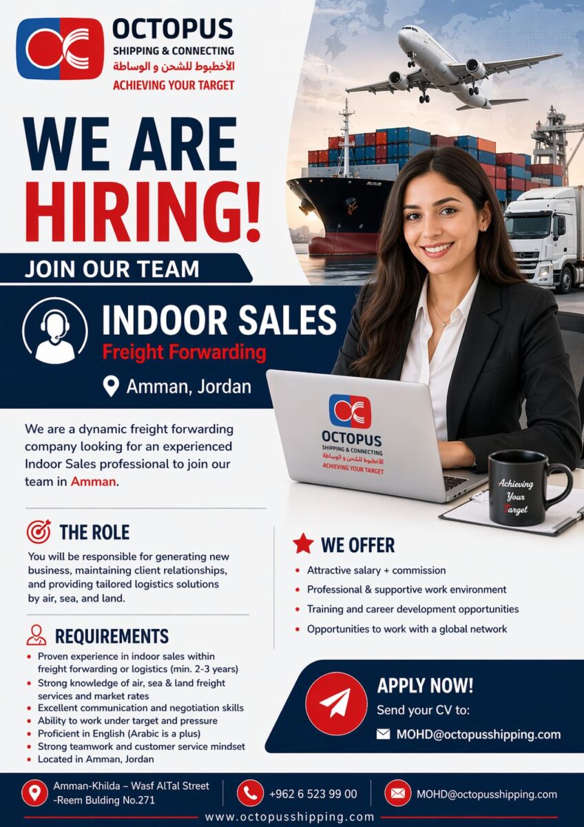 تطرح Octopus Shipping & Connecting فرصة Indoor Sales في عمّان، الأردن ضمن قطاع الشحن والخدمات اللوجستية، وهو مجال يعتمد على سرعة الاستجابة، قوة العلاقات، وفهم تفاصيل السوق والأسعار. هذه الوظيفة مناسبة للمرشحين الذين يملكون خبرة فعلية في Freight Forwarding ويستطيعون تحويل المعرفة التشغيلية إلى فرص بيع حقيقية وحلول شحن مصممة بحسب احتياجات العملاء.