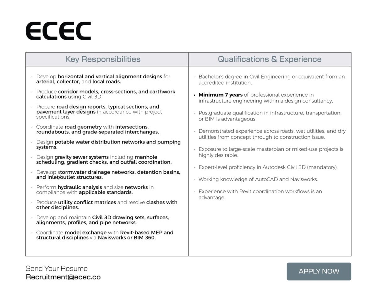 - الإعلان يوضح طلب خبرة قوية في Civil 3D، ما يجعلها فرصة مناسبة للمتخصصين الجاهزين تقنيًا.