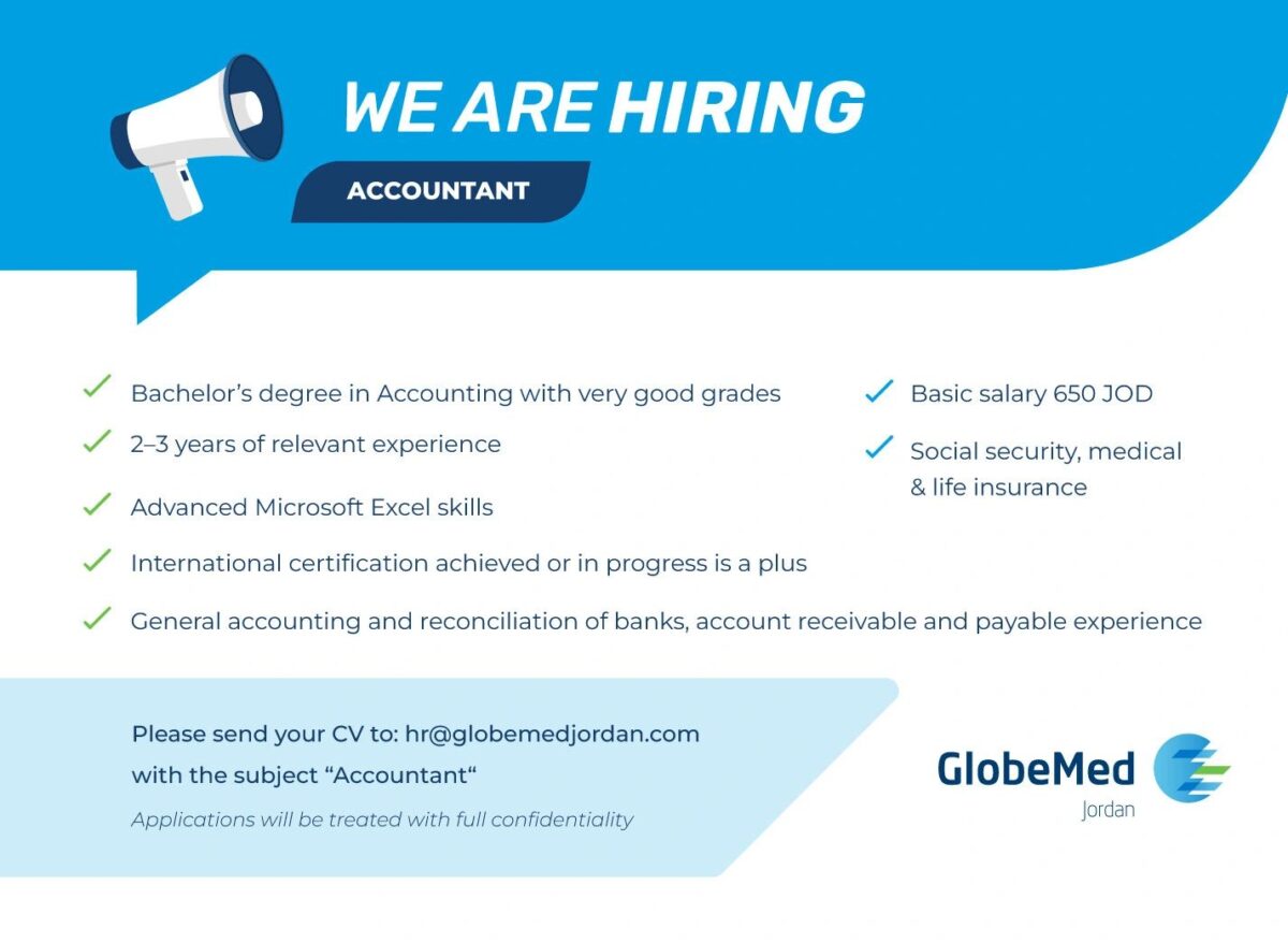 تعلن شركة GlobeMed Jordan عن حاجتها لتعيين محاسب جديد لعام 2025 للعمل ضمن فريقها المالي، لضمان إدارة الحسابات وتسوية البيانات المالية بدقة وفعالية.