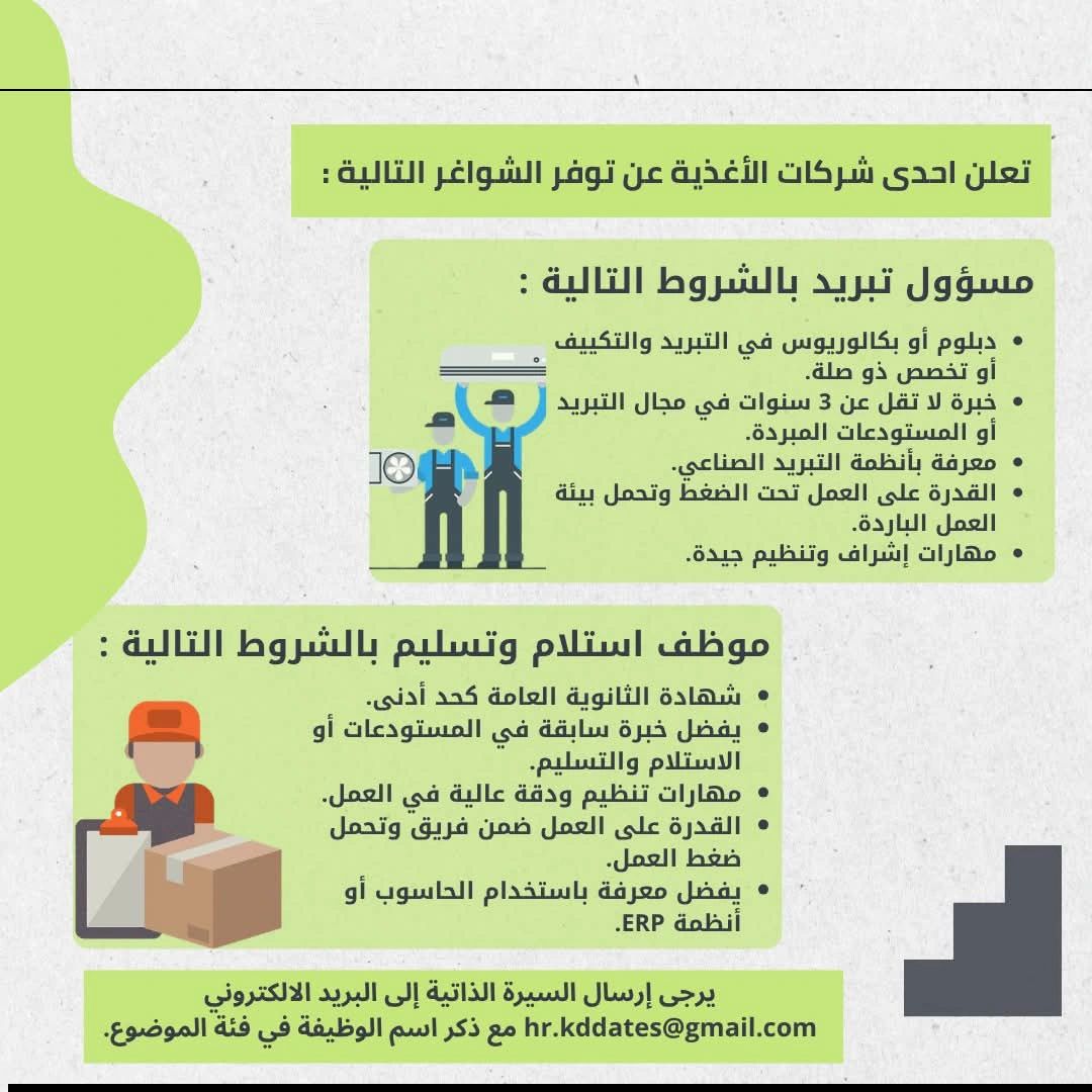 • الخبرة: 3 سنوات على الأقل لوظيفة مسؤول تبريد، وخبرة سابقة مفضلة لوظيفة موظف استلام وتسليم