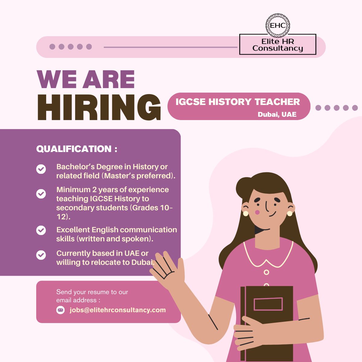 تعلن Elite HR Consultancy عن توفر وظيفة معلم تاريخ IGCSE للعمل في دبي، الإمارات العربية المتحدة، لدى مؤسسة تعليمية مرموقة.