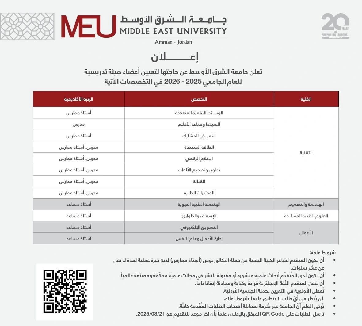 تعلن جامعة الشرق الأوسط (MEU) عن حاجتها لتعيين أعضاء هيئة تدريس للعام الجامعي 2025–2026 في مجموعة من التخصصات الأكاديمية ضمن الكليات التالية: