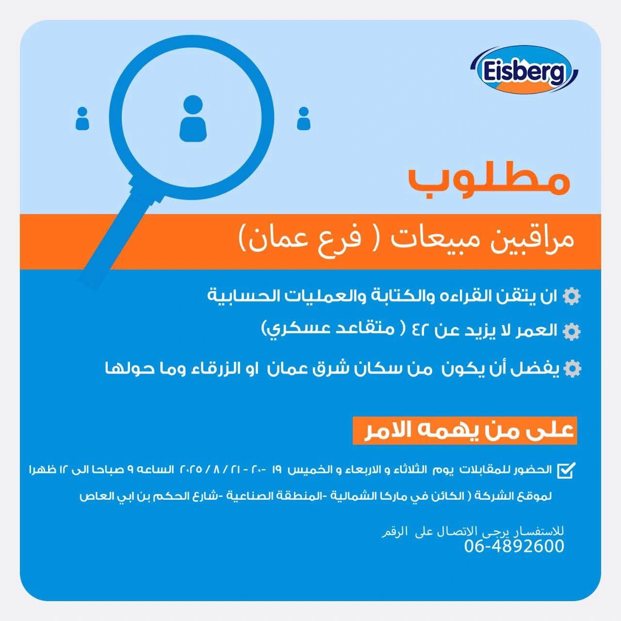 تُعلن شركة Eisberg عن حاجتها لتعيين مراقبين مبيعات لفرعها في العاصمة عمّان، وفقًا للشروط التالية: