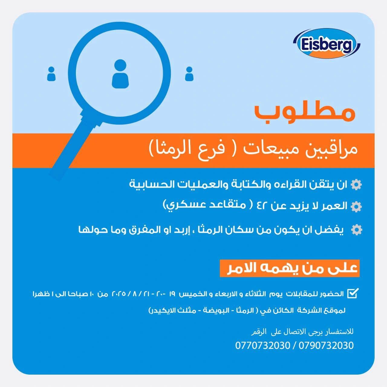 تعلن شركة Eisberg عن توفر شواغر لوظيفة مراقب مبيعات في فرعها بـالرمثا، وذلك حسب الشروط التالية:
