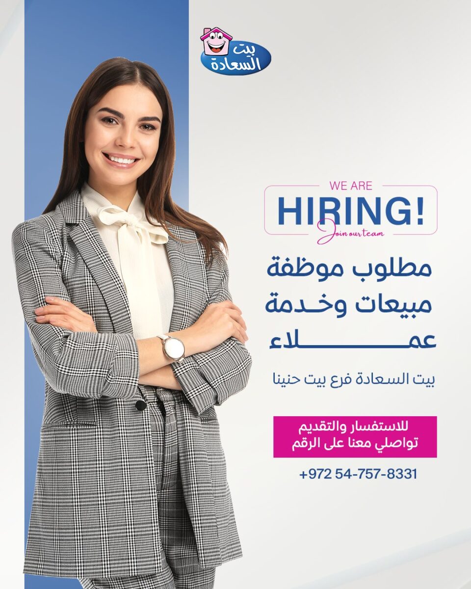 يعلن بيت السعادة عن توفر فرصة عمل مميزة لعام 2025 بمسمى موظفة مبيعات وخدمة عملاء في فرع بيت حنينا – القدس.